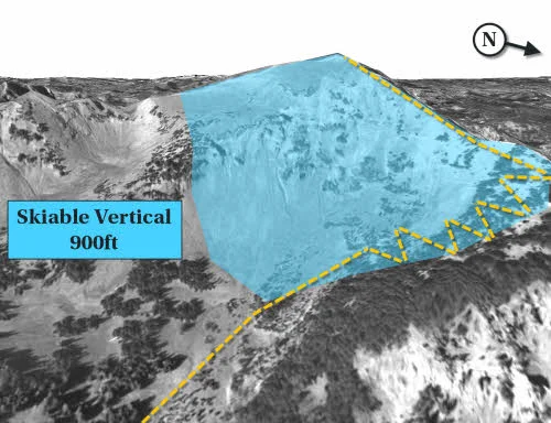 There are many descent options available on Mt. Blackmore, and your chosen route will depend on what kind of adventure you are after. The path illustrated above goes to the very top of the mountain and would require mountaineering expertise to reach the summit, however you can also simply descend before reaching the peak for a great but slightly shorter run.