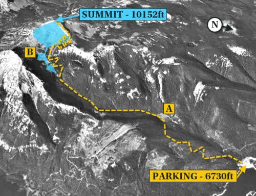 The skin track starts by heading south out of the parking lot and then follows the summer hiking trail to Mt. Blackmore. After leaving the parking lot, you will gain elevation by heading up a series of flat switchbacks and then descend down to Blackmore Lake (A). Given that almost all of the approach follows a Forest Service hiking trail, it is usually free of trees and easy to find your way.